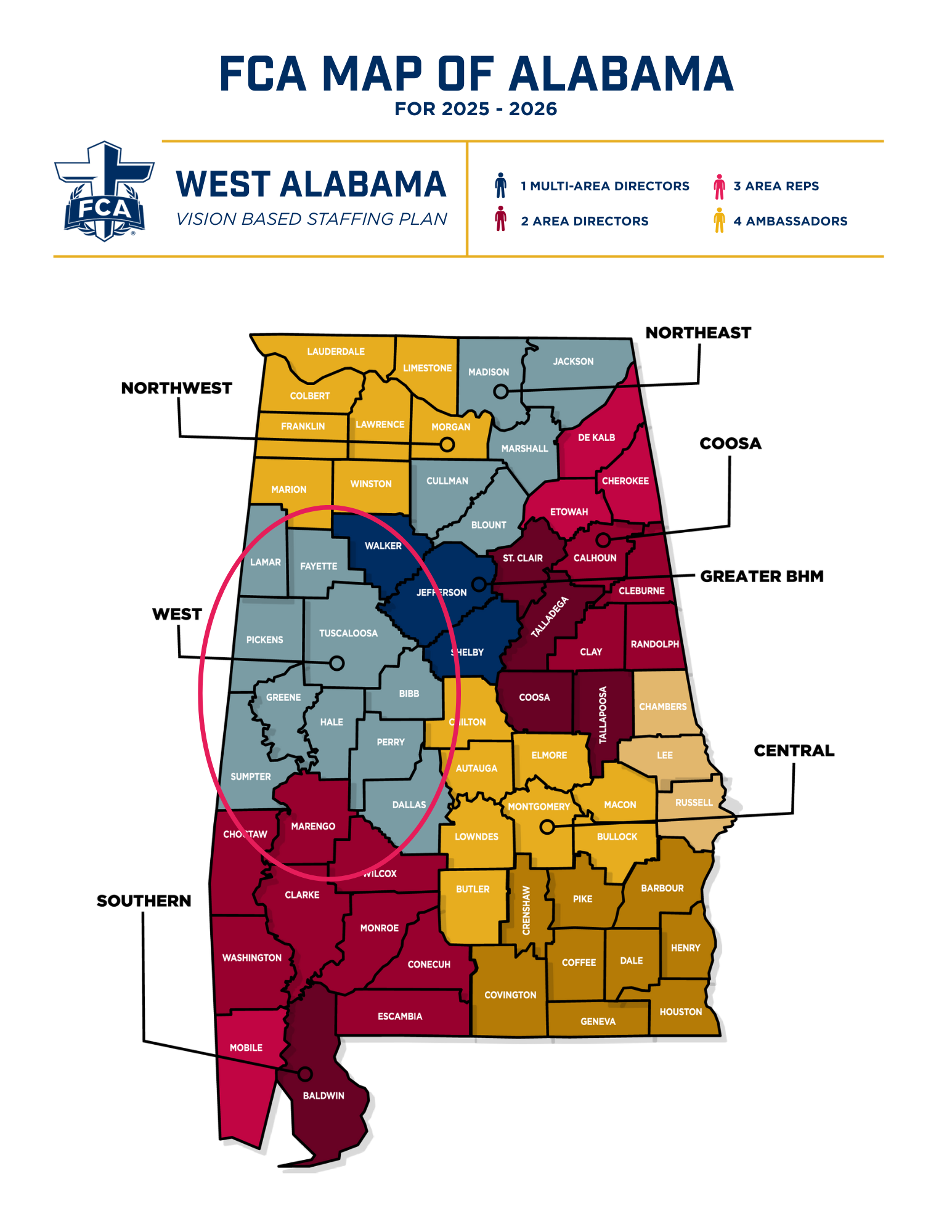 The map below shows the area of the state served by West Alabama FCA.